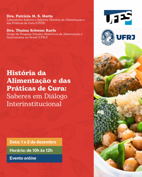 Nos dias 1 e 2 de dezembro, das 10h às 12h, será realizado o evento online História da Alimentação e das Práticas de Cura: Saberes em Diálogo Interinstitucional.
